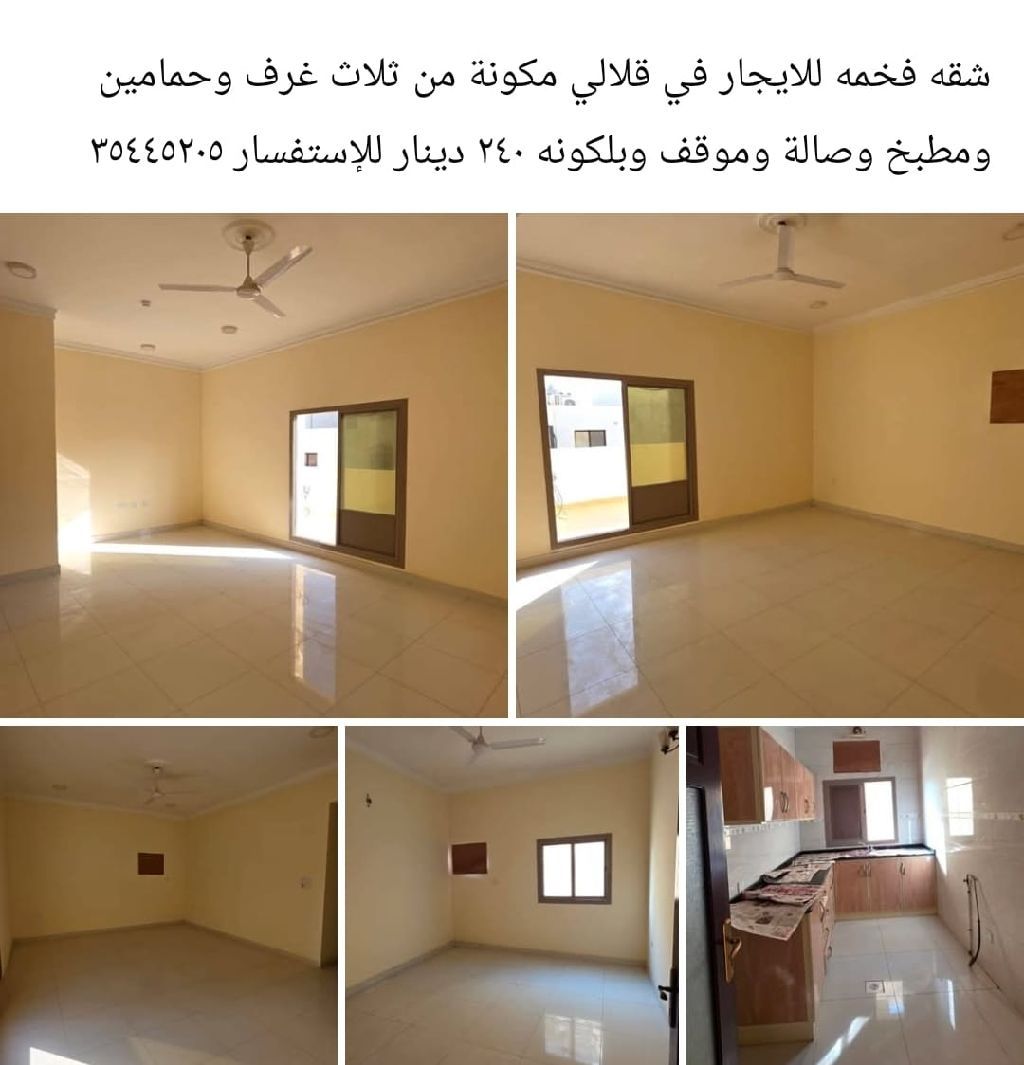 شقة فخمة للإيجار في قلالي، مكونة من ثلاث غرف وحمامين ومطبخ وصالة وموقف وبلكونه، بسعر 240 دينار