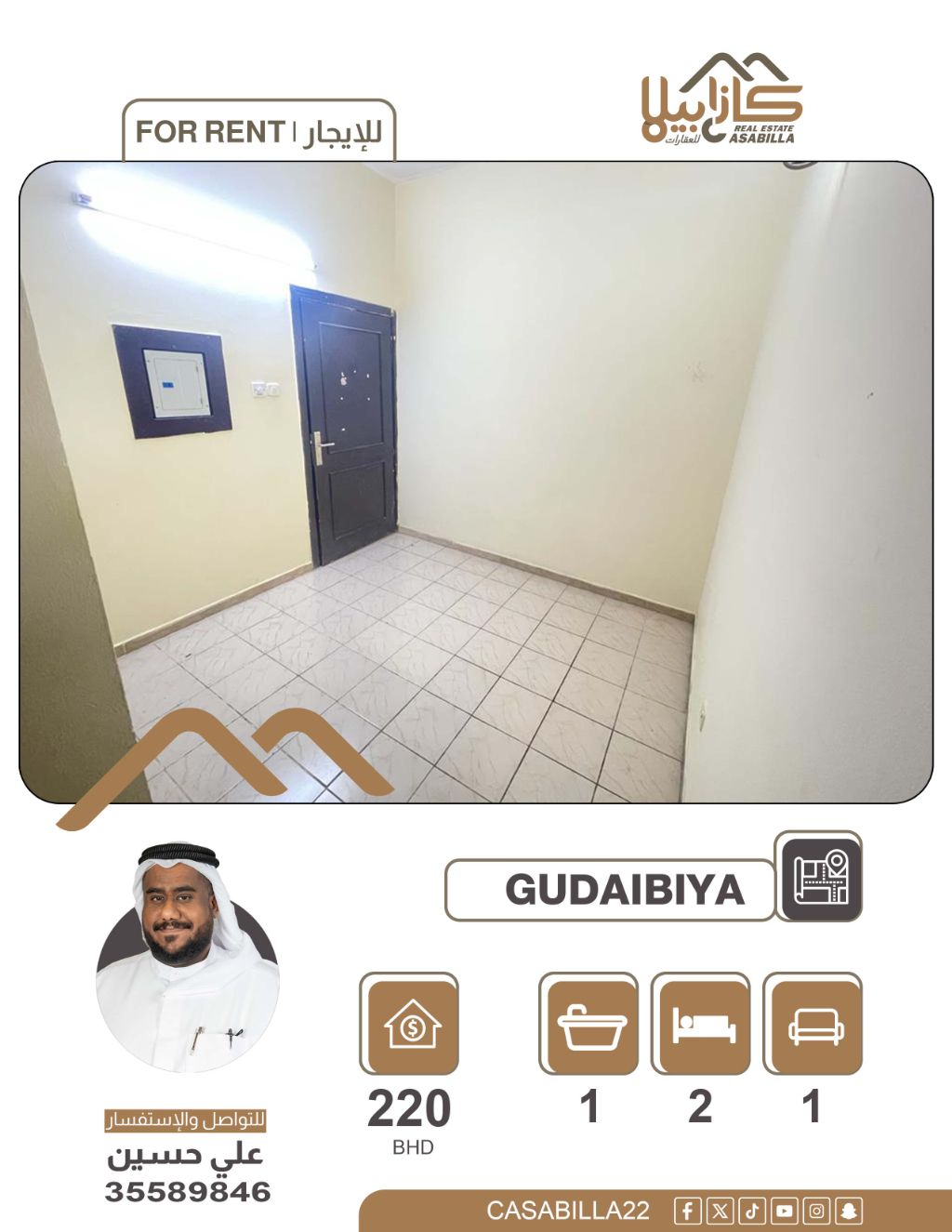 شقة للإيجار في القضيبية. التفاصيل: غرفتان نوم، صالة، مطبخ، حمام. مكيفات الهواء مشمولة. الكهرباء مشمولة (بحد استهلاك). الإيجار الشهري: 220 دينار بحريني. الموقع: القضيبية، بالقرب من صيدلية بهزاد ومسجد القصر.