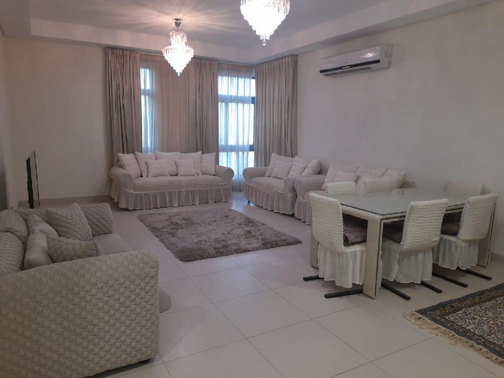 شقة للإيجار في دانات مدينة عيسى، نصف مفروشة، منفصلة عن الجيران. تتكون من 3 غرف نوم، غرفة للعاملة المنزلية، غرفة للمغسلة، 4 حمامات، صالة كبيرة، 2 بلكون، ومواقف سيارات. الإيجار 400 دينار، غير شامل.