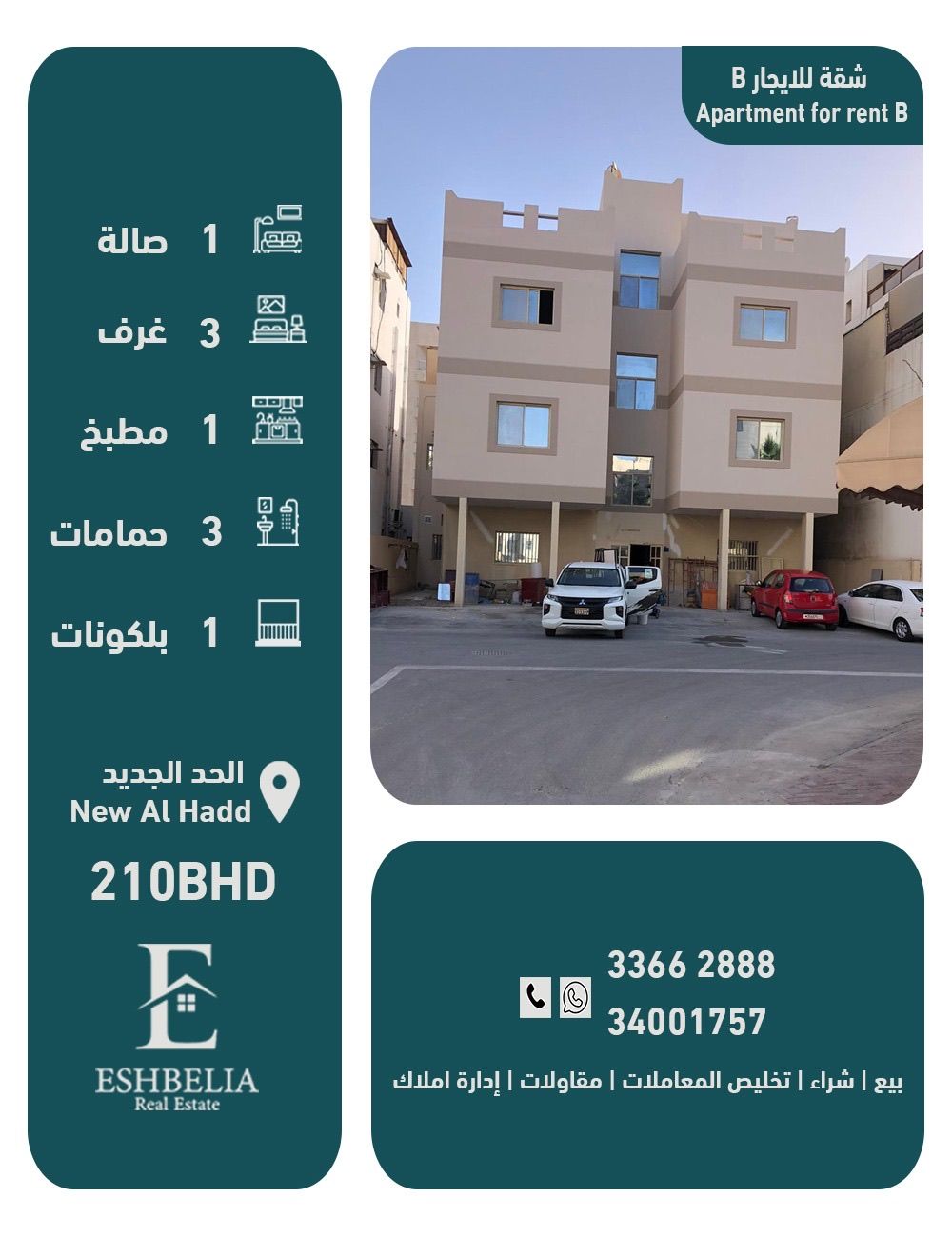 يوجد لدينا بناية تتكون من (6) شقق للإيجار في منطقة الحد الجديد قريب من الخدمات. المجموعة ب تتكون من (4) شقق. مكونات الشقة: 3 - غرف نوم واسعة بما فيها غرفة ماستر، 3 - حمامات، 1 - مطبخ، 1 - صالة، 1 - بلكونة. السعر المطلوب (210) دينار. رقم الرخصة: B201804 / 0125. للتواصل: مكتب إشبيلية بوعبدالله. إعلان رقم (90).