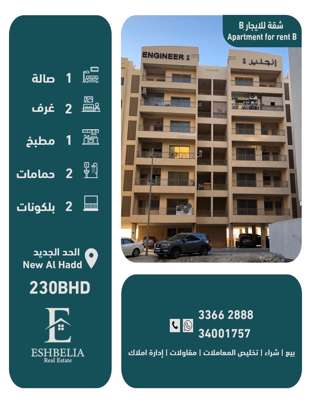 يوجد لدينا بناية تتكون من (9) شقق للإيجار في منطقة الحد الجديد قريب من الخدمات. مجموعة B تتكون من (6) شقق. مكونات الشقة: 2 - غرف نوم واسعة وفيها ماستر، 2 - حمامات، 1 - مطبخ، 1 - صالة، 2 - بلكونة. السعر المطلوب (230) دينار. يوجد فيها مصعد، حارس أمن على مدار الساعة، وكاميرات مراقبة. رقم الرخصة: B201804 / 0125. للتواصل: مكتب إشبيلية بوعبدالله. إعلان رقم (91).