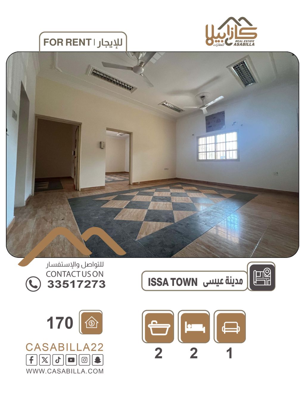 للإيجار: شقة نظيفة في مدينة عيسى، قريبة من مطعم الشعلة. تحتوي على غرفتين نوم (واحدة ماستر)، حمامين، مطبخ، صالة، مدخل خاص، ومدخل عام. يوجد مكان لغسيل الملابس، موقف سيارات مظلل، وهي قريبة من الخدمات والمجمعات التجارية والمطاعم والمدارس والمسجد. الإيجار 170 دينار بحريني، غير شامل الكهرباء والماء. للتواصل.