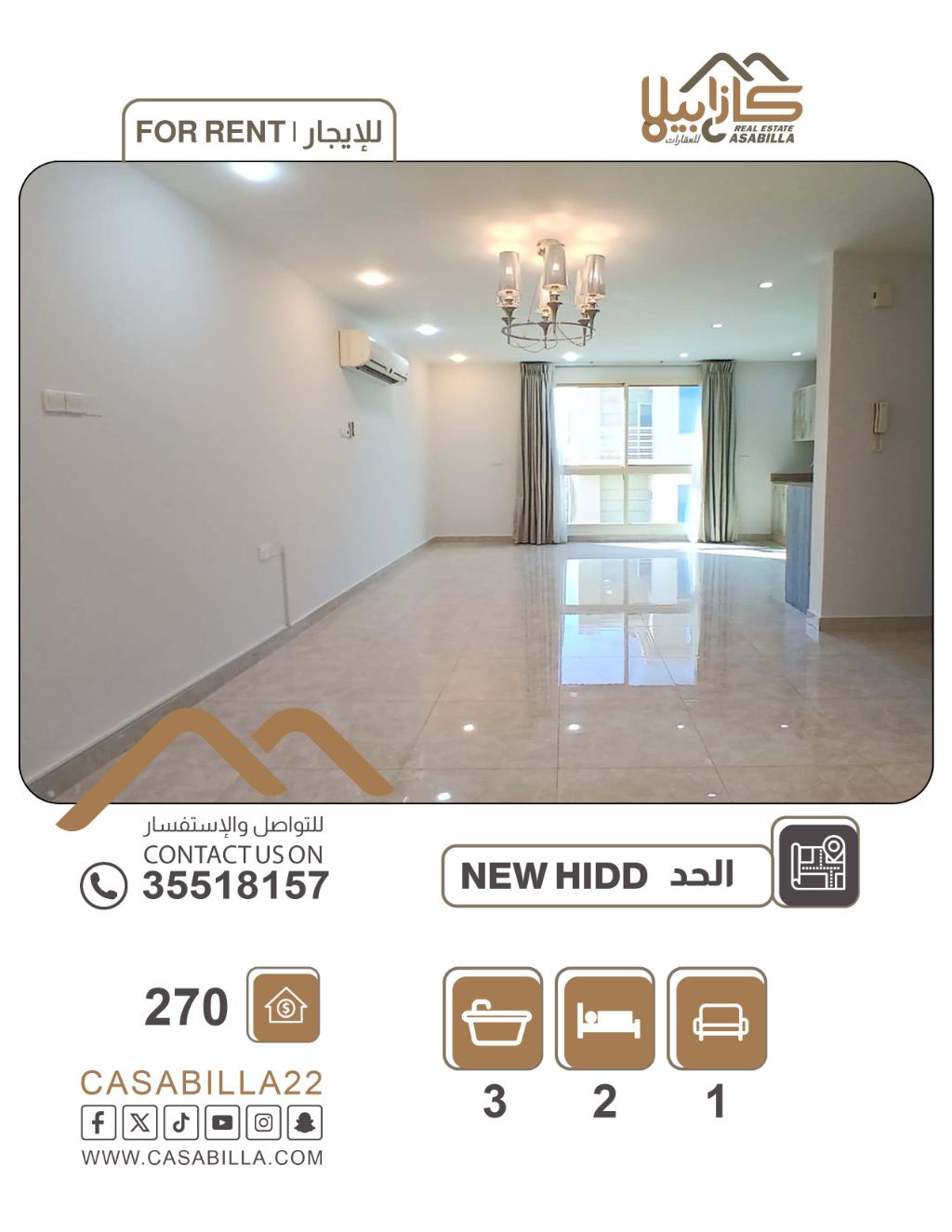 للإيجار، شقة راقية في منطقة الحد الجديدة، تتكون من غرفتي نوم ماستر، صالة واسعة، مطبخ مفتوح، ثلاثة حمامات، بلكونة، مع مكيفات. السعر: 270 دينار، شامل الكهرباء مع حد استهلاك 20 دينار. للاستفسار.