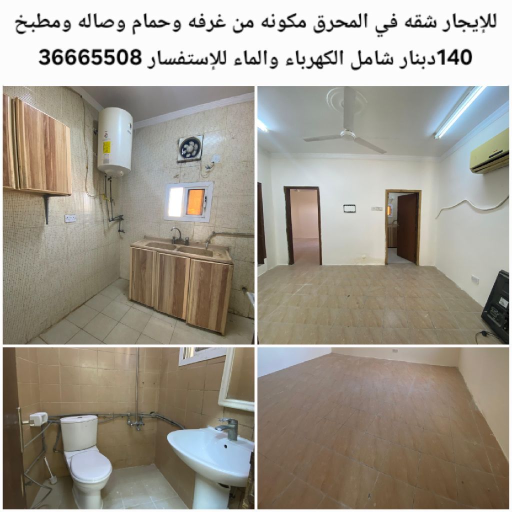 للإيجار شقة في المحرق مكونة من غرفة وحمام وصالة ومطبخ بسعر 140 دينار شامل الكهرباء والماء