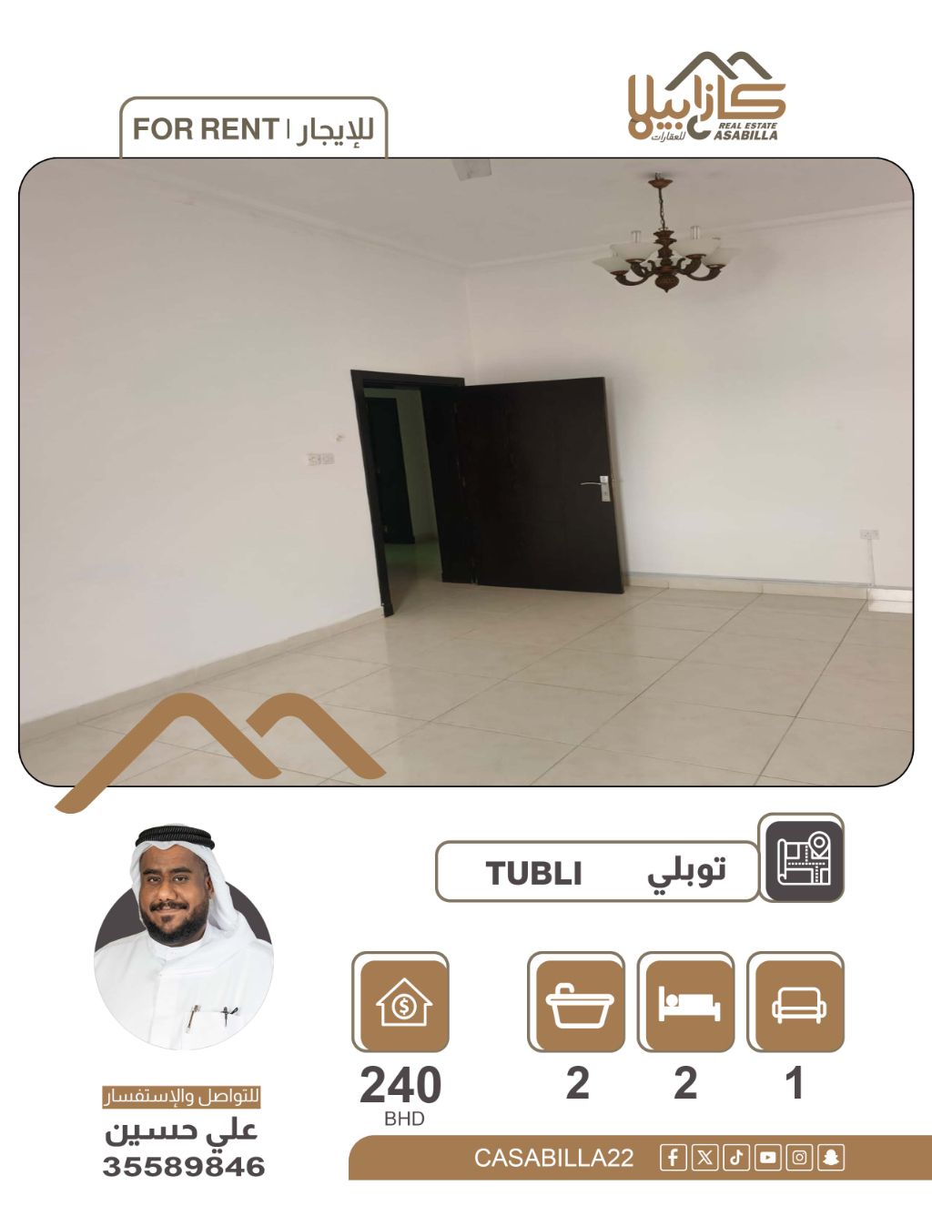 للإيجار: شقة سكنية في توبلي، تشمل الكهرباء والماء. شقة سكنية مريحة وعملية في موقع حيوي بخليج توبلي، تتميز بالقرب من كافة الخدمات وسهولة الوصول إليها. الموقع: خليج توبلي. غرفتان نوم، صالة مريحة، مطبخ، حمامان. موقع حيوي وقريب من جميع الخدمات، يشمل رسوم الكهرباء والماء. السعر: 240 دينار (شامل). للاستفسار: للإيجار، توبلي، شقة للإيجار، شامل الكهرباء، عقارات البحرين.