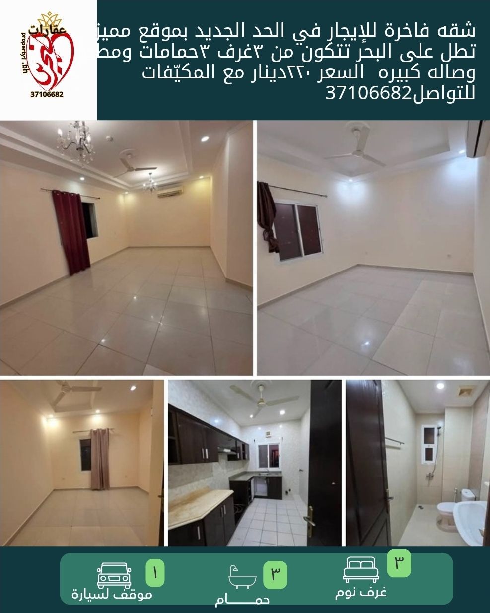 شقة فاخرة للإيجار في الحد الجديد بموقع مميز تطل على البحر. تتكون من 3 غرف نوم، 3 حمامات، مطبخ، وصالة كبيرة. السعر 220 دينار مع المكيفات. للتواصل