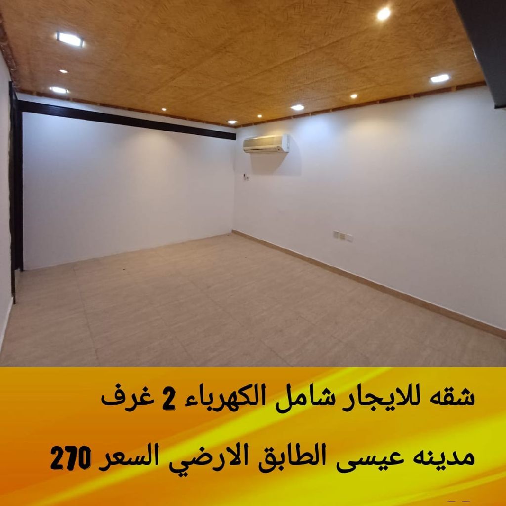 للإيجار: شقة تشمل الكهرباء والماء، بدون حد للكهرباء، في مدينة عيسى، الطابق الأرضي. تتكون من غرفتي نوم كبيرتين، حمامين، صالة، مطبخ كبير، وحوش. السعر: 270 دينار بحريني شامل الكهرباء والماء، بدون حد للكهرباء. للتواصل.