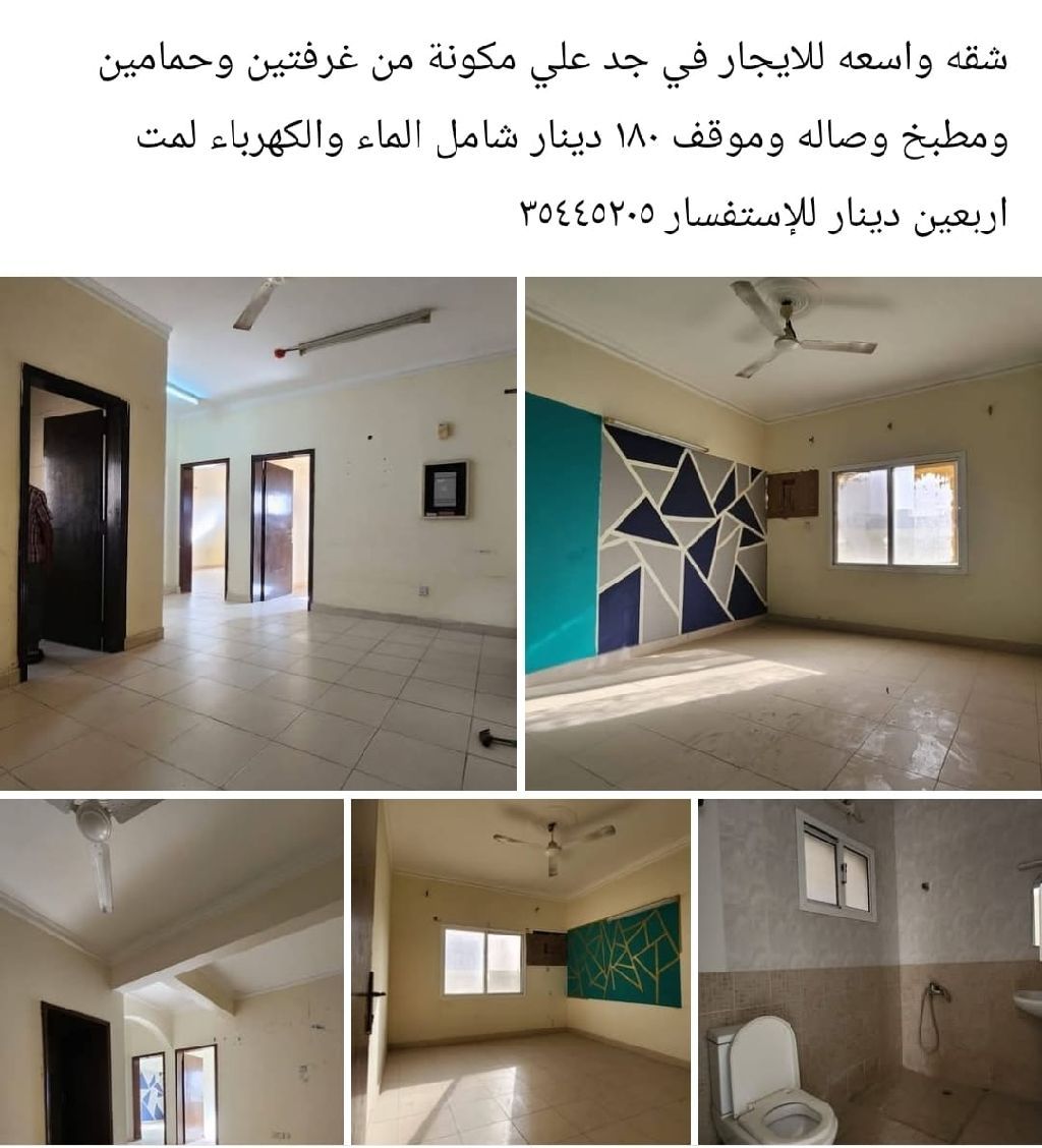 شقة واسعة للإيجار في جد علي، مكونة من غرفتين وحمامين ومطبخ وصالة وموقف. الإيجار 180 دينار شامل الماء والكهرباء لمدة أربعين دينار