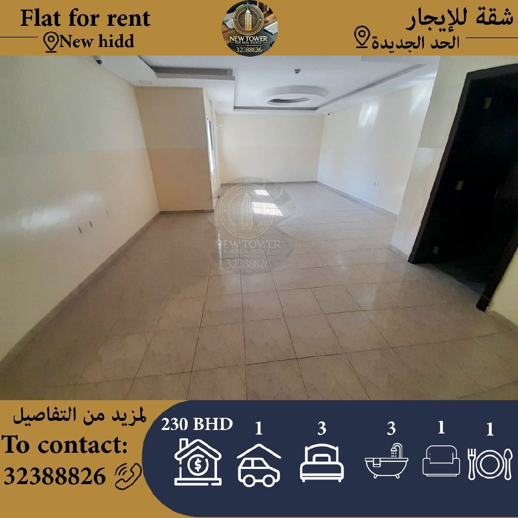 للإيجار: شقة كبيرة في الحد مع مكيفات هواء، 3 غرف نوم، 3 حمامات، مطبخ، صالة معيشة كبيرة جداً، مصعد، بلكونة، وموقف سيارة بسعر 230 دينار بحريني. للتواصل: البرج الجديد للعقارات.