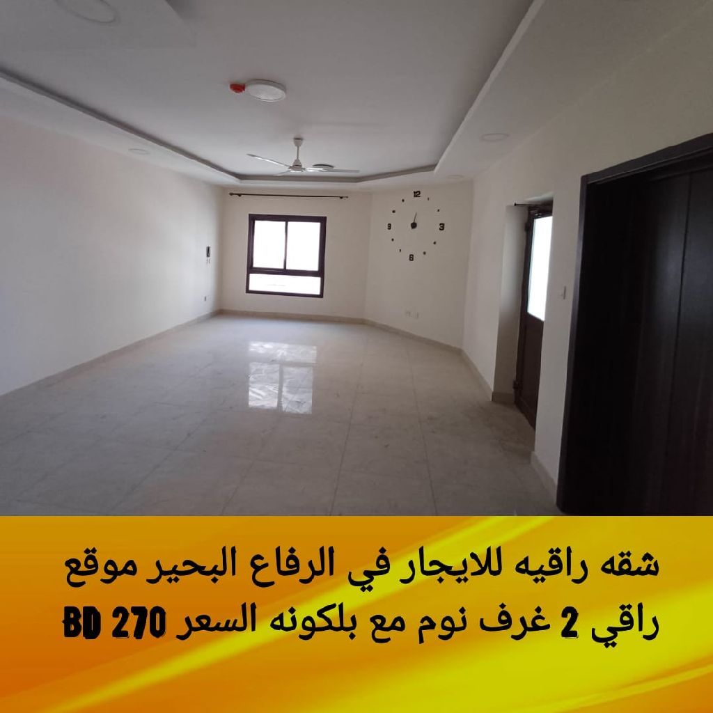 شقة راقية للإيجار في موقع مميز في الرفاع البحري، تتكون من غرفتي نوم، حمامين، صالة، مطبخ، وبلكونة. تتضمن مصعدًا وموقفًا خاصًا. السعر: 270 دينار بحريني. للتواصل.