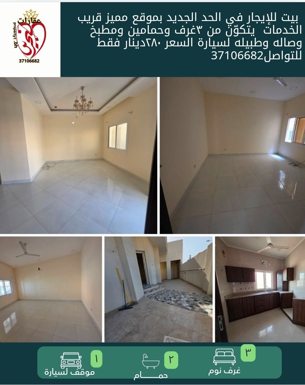 بيت للإيجار في الحد الجديد بموقع مميز قريب الخدمات. يتكون من 3 غرف وحمامين ومطبخ وصالة وطبيلة لسيارة. تم تخفيض السعر إلى 260 دينار فقط. للتواصل.
