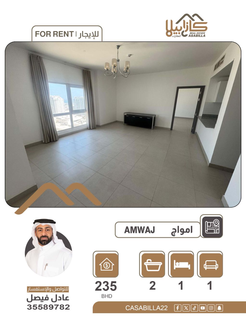 للإيجار شقة غير مفروشة في موقع جيد بجزر أمواج. تفاصيل الشقة: غرفة نوم واحدة، صالة، حمامان، مطبخ، غير مفروشة. الإيجار الشهري 235 دينار. للتواصل والاستفسار.