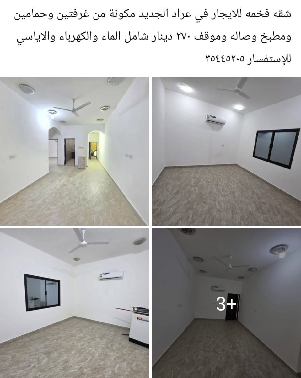 شقة فخمة للإيجار في عراد الجديد، مكونة من غرفتين وحمامين ومطبخ وصالة وموقف، بسعر 270 دينار شامل الماء والكهرباء والمكيفات. فرصة لا تعوض