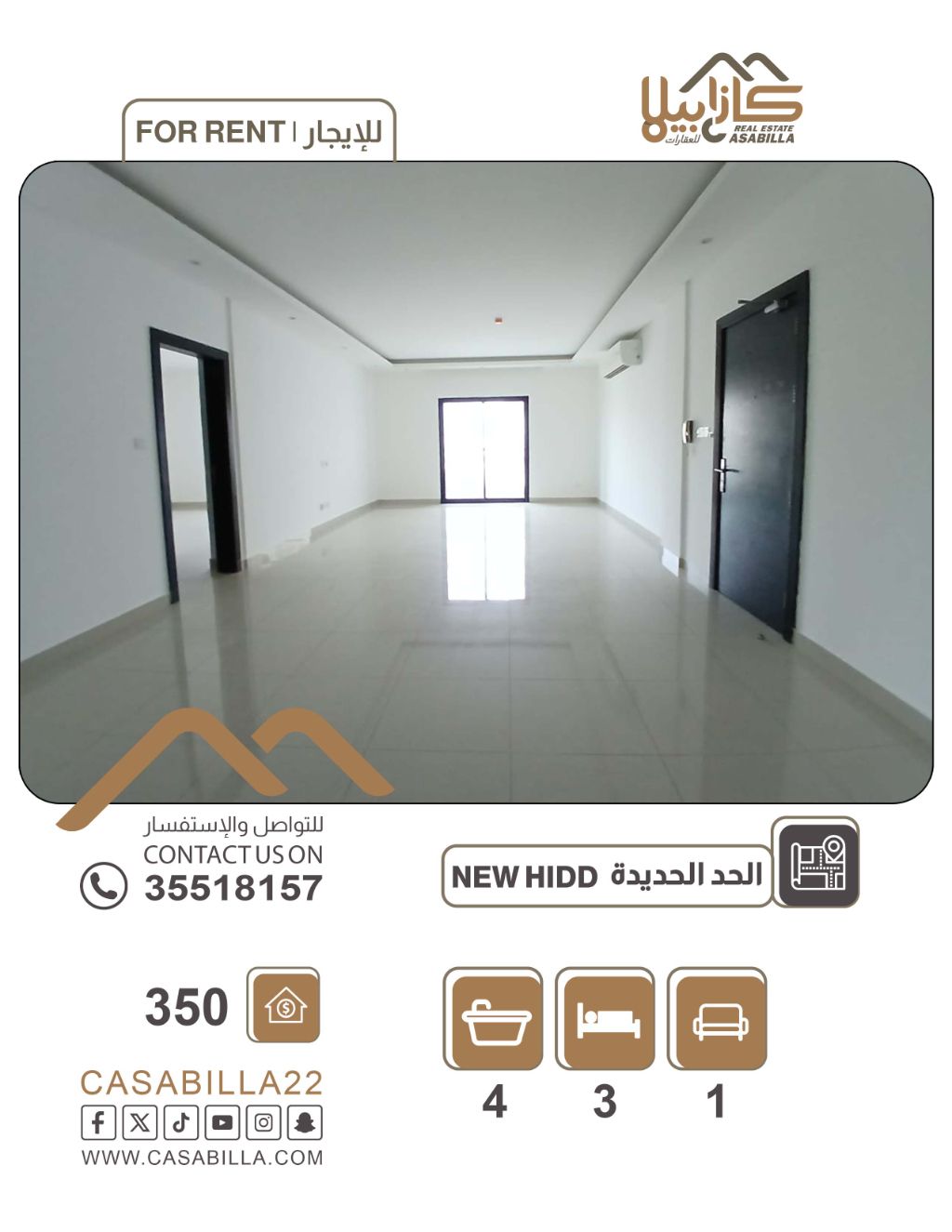 للإيجار: شقة فاخرة وواسعة في منطقة الحد الجديدة، تتكون من 3 غرف نوم، صالة عائلية كبيرة، غرفة خادمة، 4 حمامات، مطبخ فاخر مجهز بفرن وشواية وميكروويف، تكييف سبليت، بلكونتين واسعتين. السعر: 350 دينار، غير شامل الكهرباء. للاستفسار.
