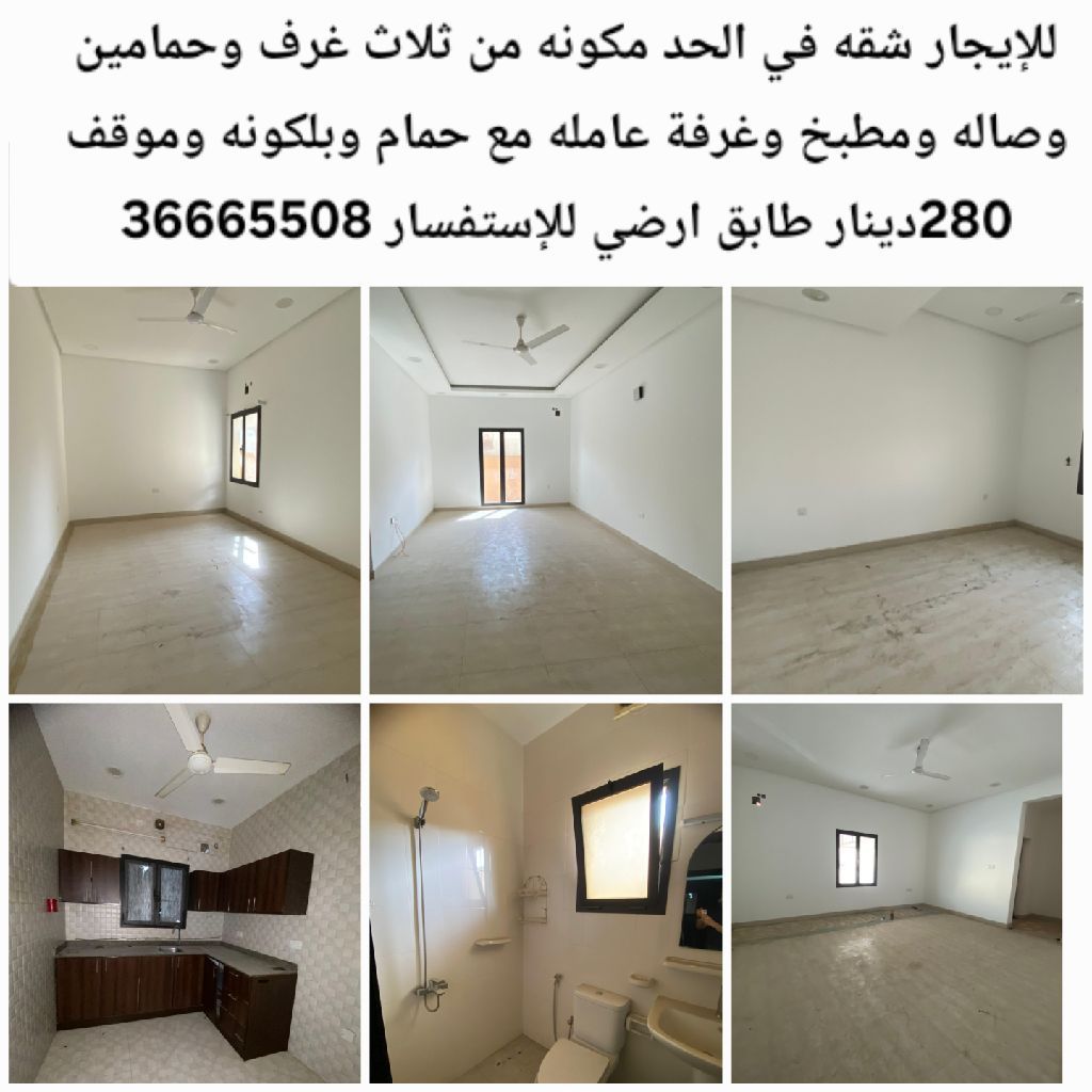 للإيجار شقة في الحد مكونة من ثلاث غرف وحمامين وصالة ومطبخ وغرفة عاملة مع حمام وبلكونه وموقف 280 دينار طابق أرضي