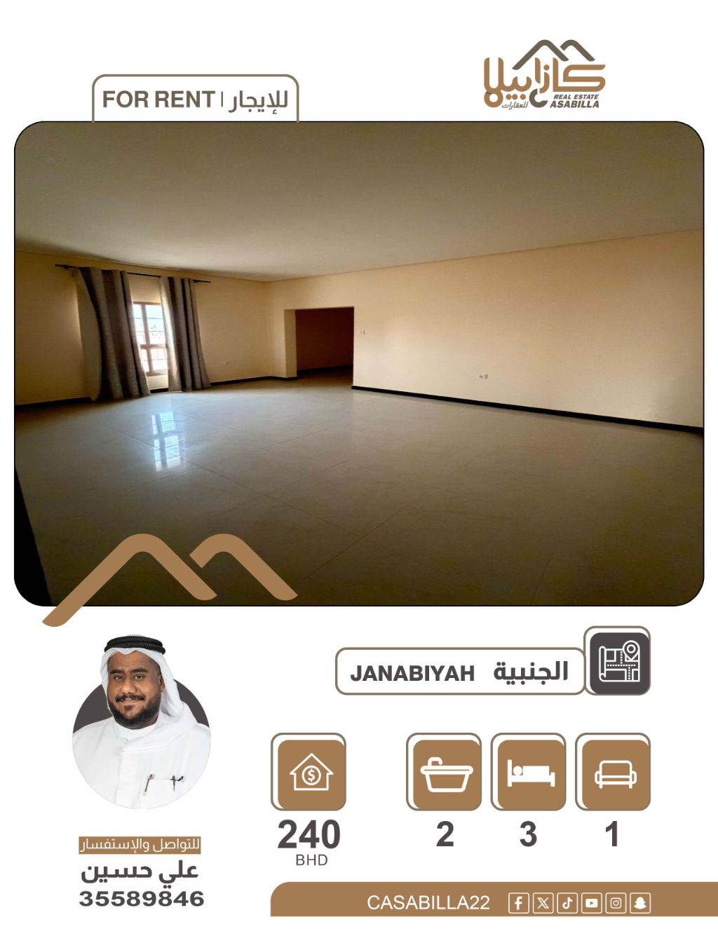 للإيجار: شقة فاخرة في الجنبية، قريبة جداً من مجمع سكوير. تتكون من 3 غرف نوم، صالة واسعة، مطبخ، وحمامين. مميزات إضافية تشمل مصعد، نظام أمن وحراسة، ومبرد ماء متوفر في الصيف. الإيجار 240 دينار بحريني بدون الكهرباء. فرصة ممتازة للسكن الراقي في موقع مميز. للتواصل والاستفسار، الرجاء التواصل على الخاص.