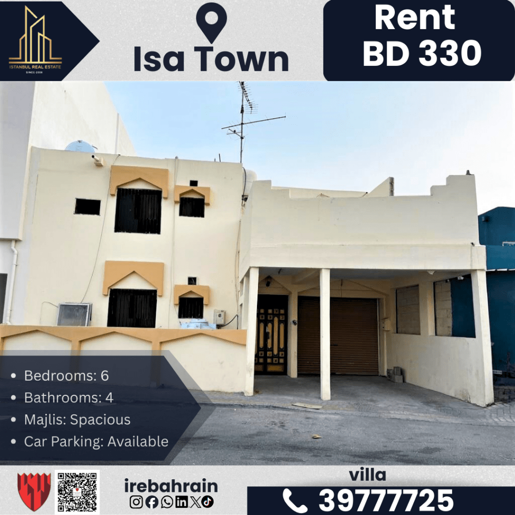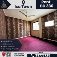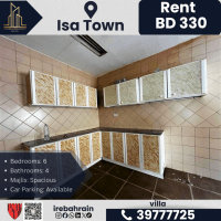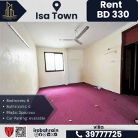فيلا للإيجار - مدينة عيسى. الإيجار: 330 دينار بحريني شهرياً (بدون رسوم الكهرباء والماء). غرف النوم: 6. الحمامات: 4. مجلس واسع. مطبخ متوفر. مواقف سيارات متوفرة. الموقع: مدينة عيسى - بالقرب من محمد. سهولة الوصول إلى جرداب وسند وجد علي وتوبلي. للتواصل.