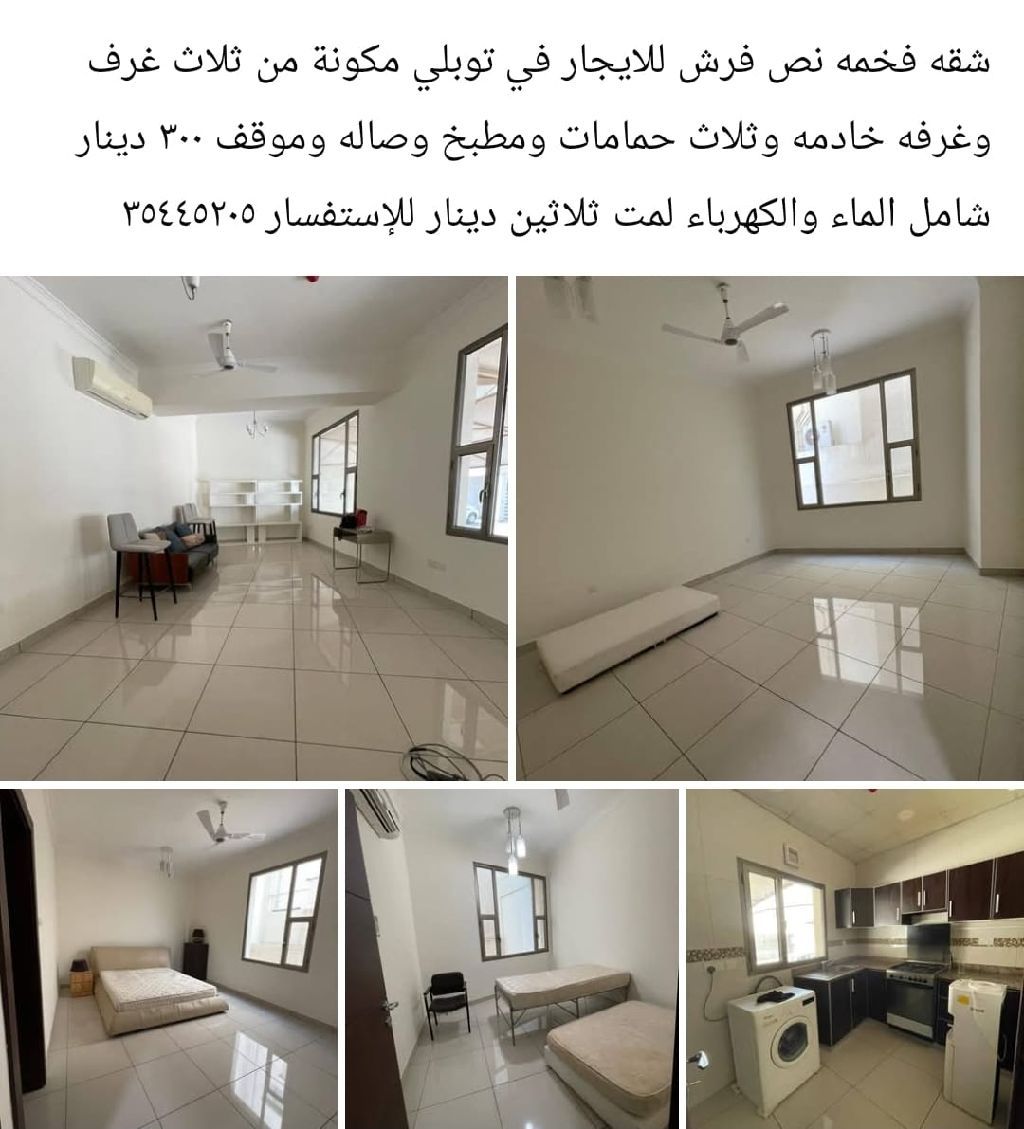 شقة فخمة نصف مفروشة للإيجار في توبلي، تتكون من ثلاث غرف وغرفة خادمة وثلاث حمامات ومطبخ وصالة وموقف. 300 دينار شامل الماء والكهرباء، مع رسوم العاملة المنزلية 30 دينار.