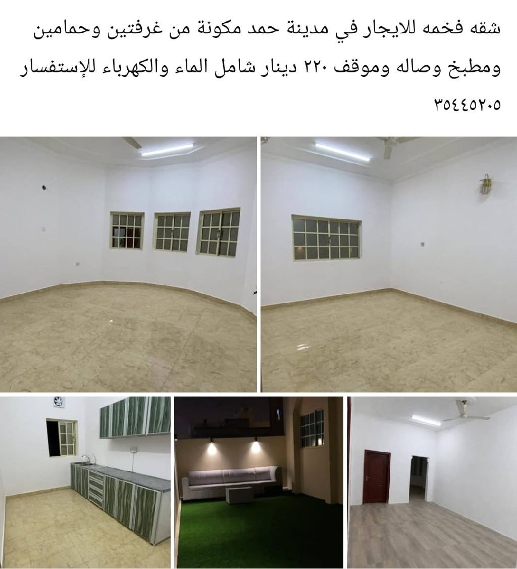 شقة فخمة للإيجار في مدينة حمد، مكونة من غرفتين وحمامين ومطبخ وصالة وموقف، بسعر 220 دينار شامل الماء والكهرباء.