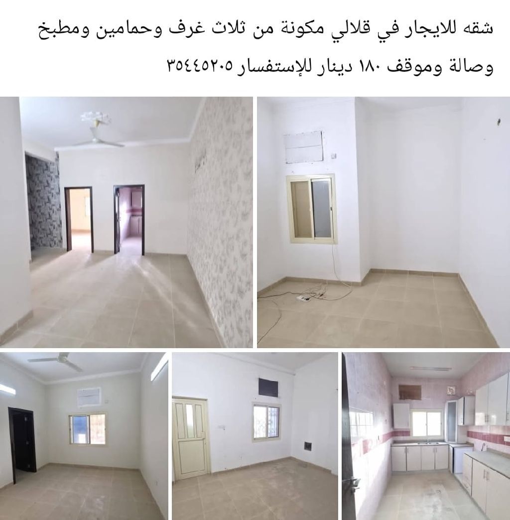 شقة للإيجار في قلالي، مكونة من ثلاث غرف وحمامين ومطبخ وصالة وموقف، بسعر 180 دينار.