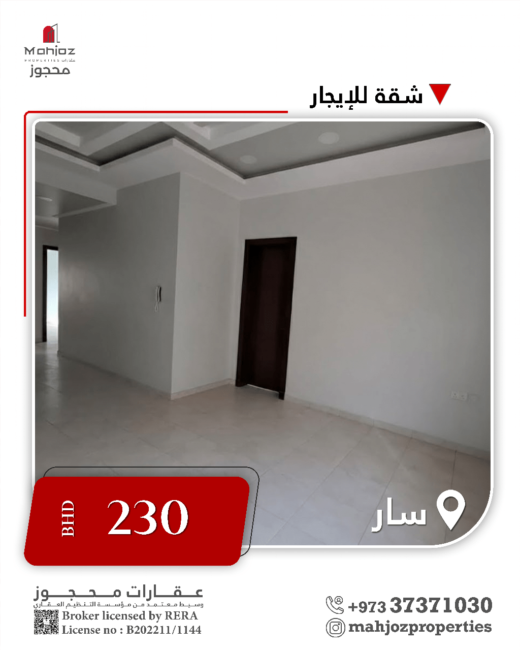 عقارات محجوز تقدم شقة للإيجار في سار. الموقع: سار. 3 غرف نوم، 2 حمامات، صالة واسعة، مطبخ، مصعد، كاميرات أمنية، موقف سيارة. الإيجار 230 دينار بحريني شهرياً. تواصل معنا لمزيد من التفاصيل.