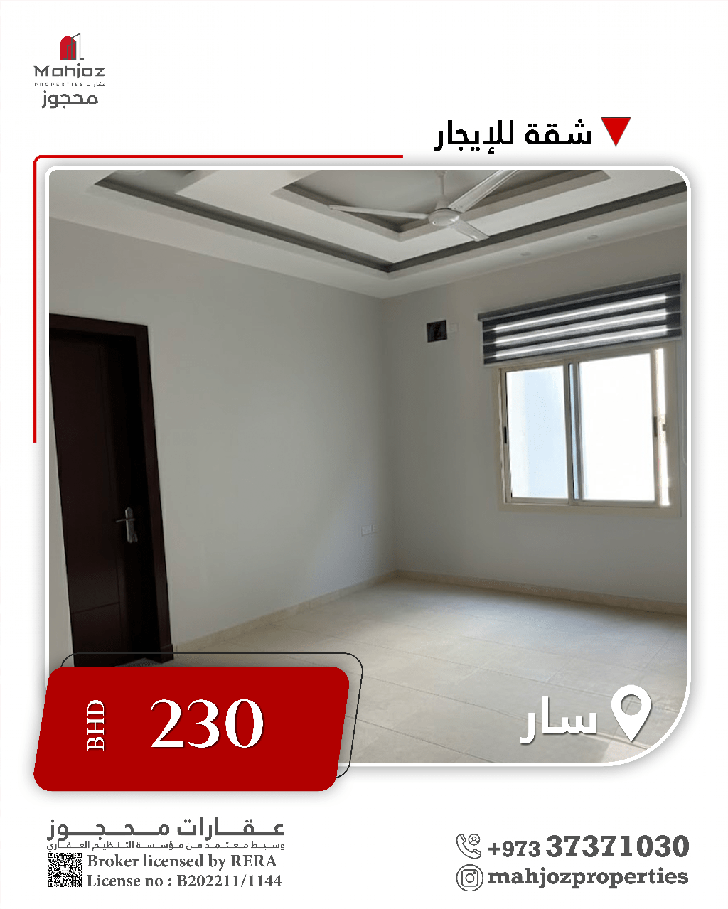 عقارات محجوز تقدم شقة للإيجار في سار. الموقع سار. تحتوي على 3 غرف نوم، 2 حمامات، صالة واسعة، مطبخ، مصعد، كاميرات أمنية، وموقف سيارة. الإيجار 230 دينار بحريني شهرياً. تواصل معنا لمزيد من التفاصيل.