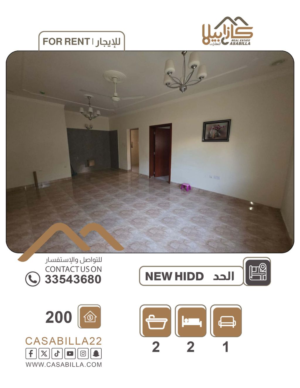 للإيجار: شقة في منطقة الحد. تفاصيل الشقة: غرفتين (غرفة ماستر)، صالة واسعة مع حمام، حمامين، مطبخ. المرافق والخدمات: موقف سيارة. الشقة في الطابق الأرضي، بالقرب من الشارع الرئيسي. سعر الإيجار: 200 دينار. للتواصل.