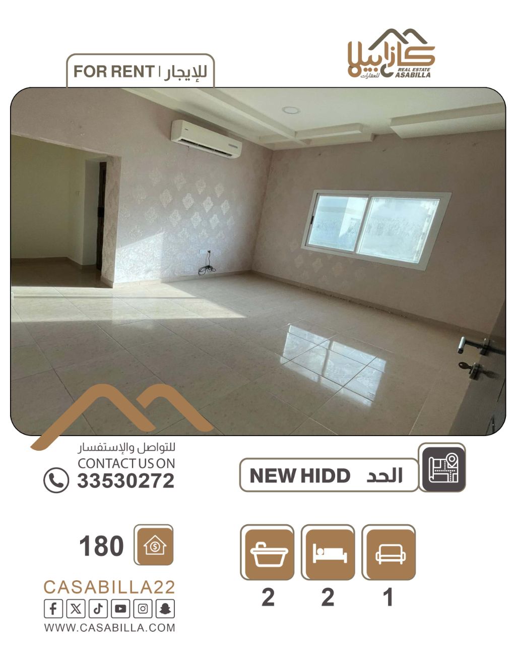 سكن عائلي مريح وبسعر استثنائي في الحد. اغتنم الفرصة للسكن في منطقة الحد الهادئة، في شقة مثالية للعائلات تجمع بين السعر الاقتصادي والموقع الحيوي. تتميز الشقة بقربها من كافة الخدمات الأساسية. مواصفات الشقة: غرفتان نوم، صالة، مطبخ، حمامان، بلكونه، مصعد، موقف سيارة. سعر الإيجار: 180 دينار بحريني. للتواصل والاستفسار.