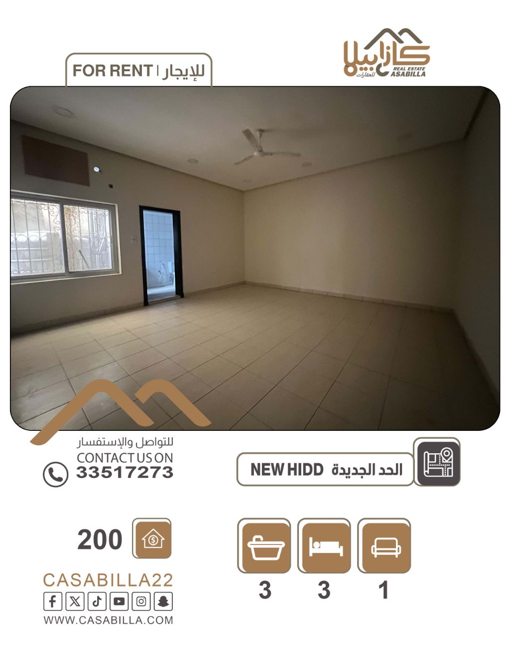 للإيجار: شقة في منطقة الحد الجديدة. تفاصيل الشقة: 3 غرف كبار (2 ماستر)، 3 حمامات، مطبخ، صالة، مخزن متوسط أو يمكن تحويله إلى غرفة خادمة. المرافق والخدمات: موقع مميز، قريبة من الخدمات، برك مظلل، مصعد، حارس. سعر الإيجار: 200 بدون الكهرباء والماء. للتواصل.