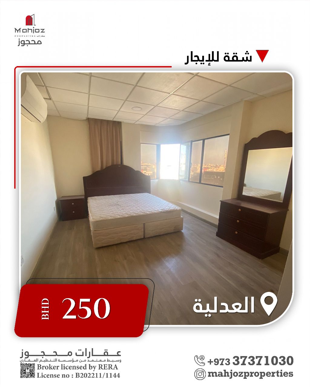 عقارات محجوز تقدم شقة للإيجار في العدلية، تقع في العدلية بالقرب من الخدمات العامة والمجمعات التجارية، مع سهولة الدخول والخروج من المنطقة وانسيابية الحركة المرورية. تتكون من غرفتين، حمامين، صالة، ومطبخ. يتوفر في المبنى مصعد وموقف سيارات. الإيجار الشهري 250 دينار. تواصل معنا لمزيد من المعلومات.