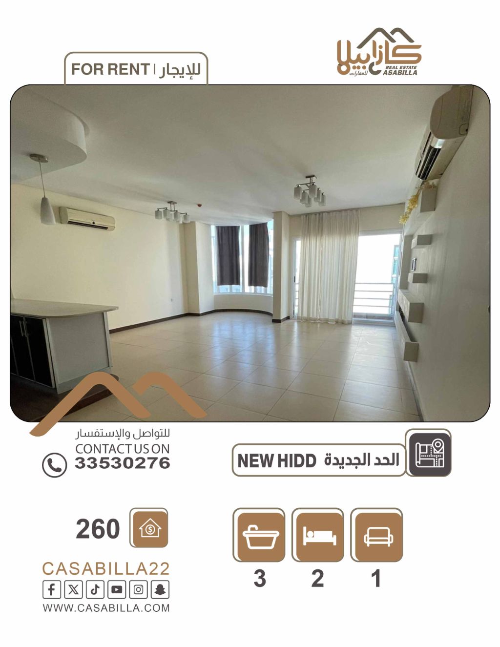 للإيجار: شقة فاخرة في الحد الجديد، مناسبة للعائلات وقريبة من جميع الخدمات. مواصفات الشقة: غرفتا نوم، ثلاثة حمامات، صالة كبيرة، مطبخ مفتوح، بلكونة، مصعد، وموقف سيارات. يشمل الماء والكهرباء (حد أقصى 30 دينار). السعر: 260 دينار بحريني. للتواصل والاستفسار.