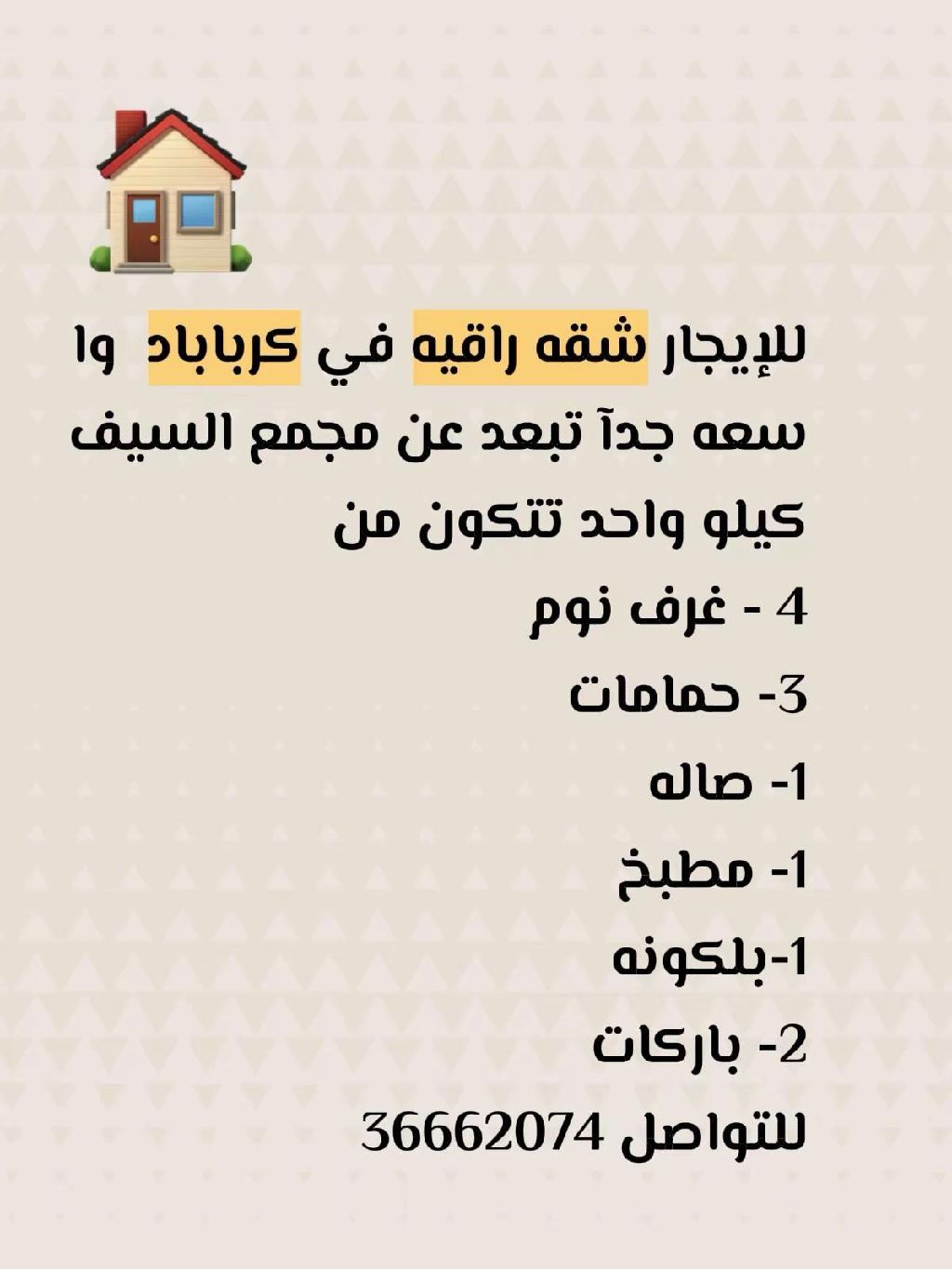 للإيجار: شقة راقية وواسعة جداً في كرباباد، تبعد كيلومتراً واحداً عن مجمع السيف. تتكون من 4 غرف نوم، 3 حمامات، صالة واحدة، مطبخ واحد، بلكونة واحدة، وموقفين للسيارات. للتواصل.