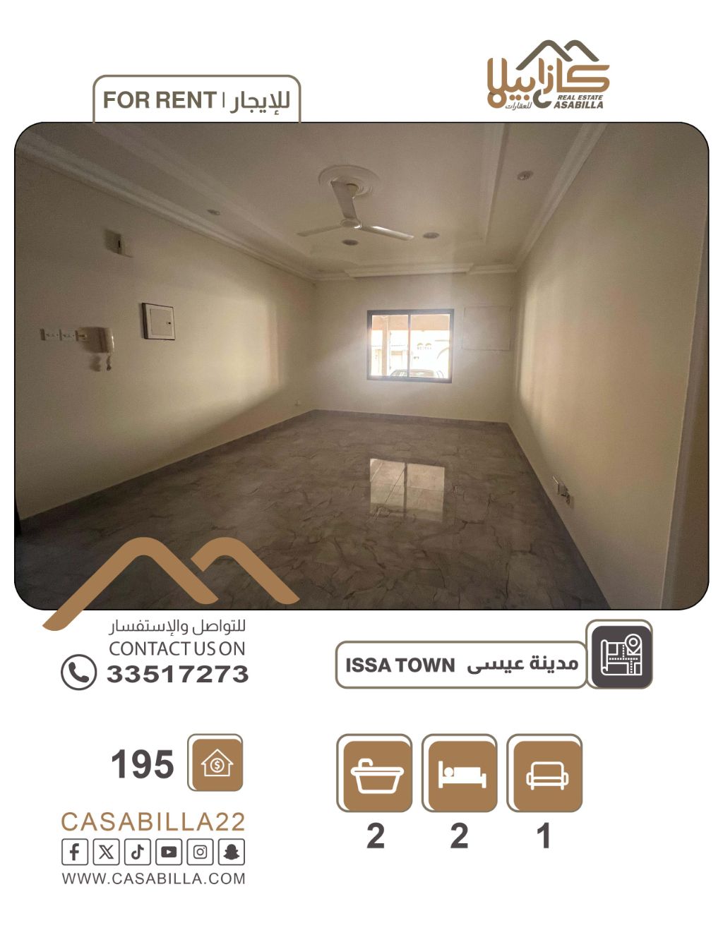 سكن عائلي نظيف ومتميز في قلب مدينة عيسى. استمتع بالراحة والهدوء في شقة تمتاز بموقعها الاستراتيجي بالقرب من 'دوار ديسكفري'، حيث تضعك في وسط كافة الخدمات الحيوية والمجمعات التجارية. مواصفات الشقة: الموقع: مدينة عيسى - بالقرب من دوار ديسكفري (موقع حيوي وسهل الوصول). الغرف: غرفتا نوم مريحتان (منها غرفة ماستر بحمام خاص لخصوصية تامة). منطقة المعيشة: صالة واسعة ومشرقة تناسب الجلسات العائلية. المطبخ: مطبخ عملي.
