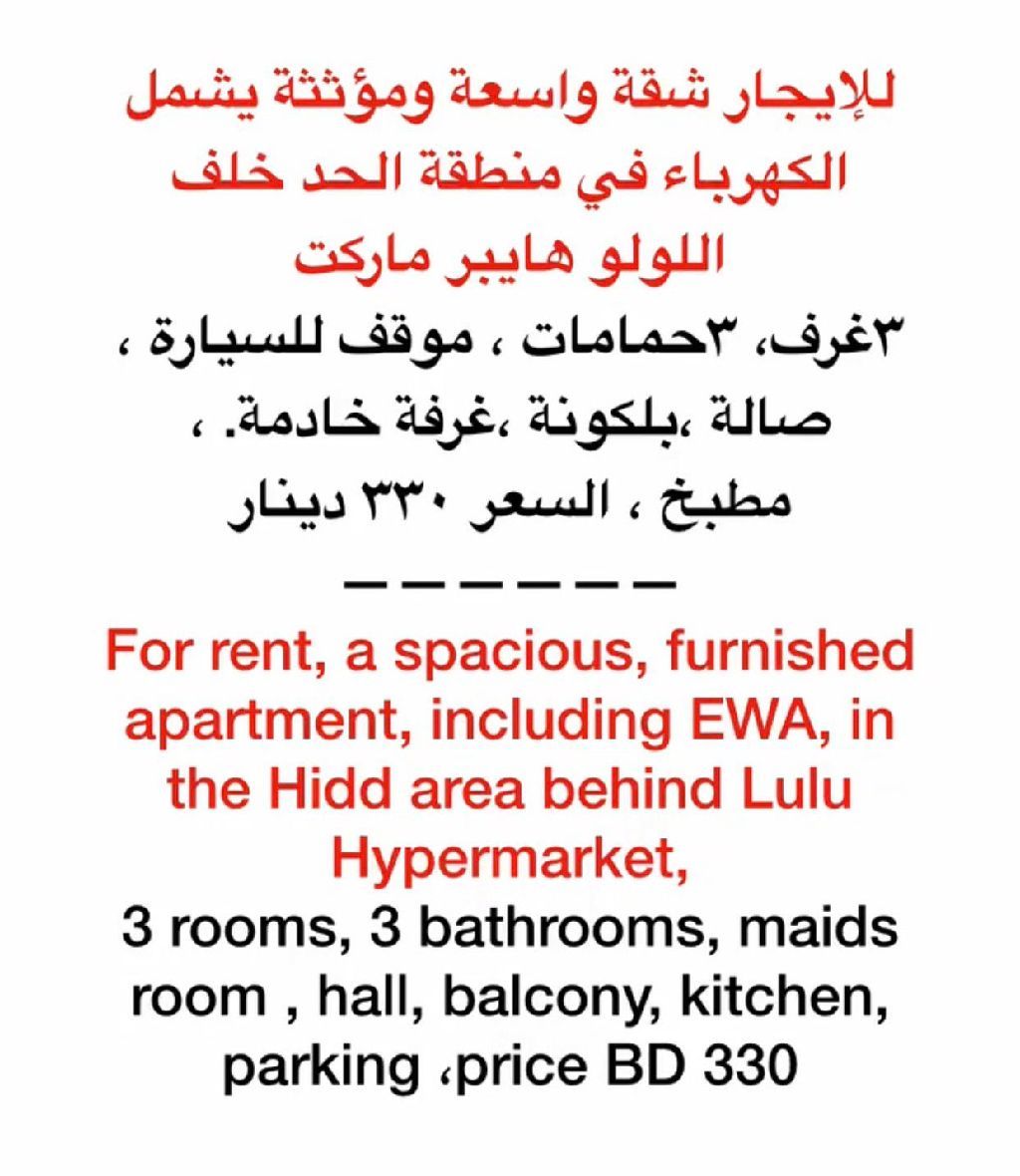 للإيجار: شقة واسعة مؤثثة في الحد، تحتوي على 3 غرف نوم، 3 حمامات، صالة، بلكونة، مطبخ، غرفة عامل منزلي، وموقف سيارات. الإيجار 330 دينار بحريني شامل الماء والكهرباء.