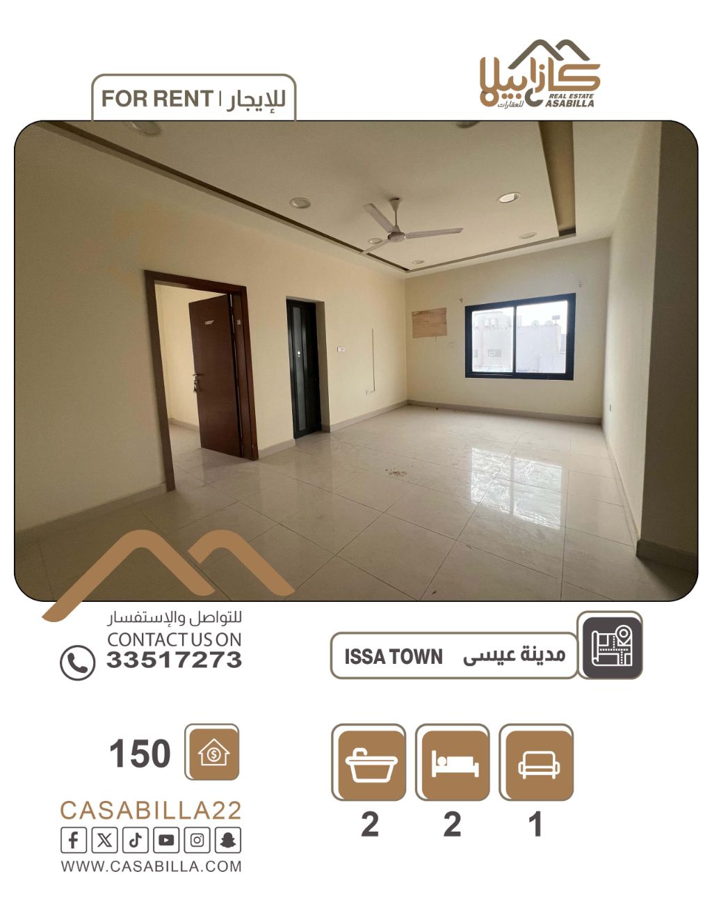 للإيجار: شقة في مدينة عيسى. أولاً، تفاصيل الشقة: غرفتي نوم (واحدة ماستر)، حمامان، صالة عائلية واسعة واحدة، مطبخ واحد، بارك مظلل. ثانياً، المرافق والخدمات: حديقة قريبة من البناية، منطقة هادئة جداً، قريبة من الخدمات وشارع رئيسي. في الدور الثاني بدون مصعد. الإيجار: 150 دينار بحريني، غير شامل الكهرباء والماء. للمزيد من المعلومات، اتصل.