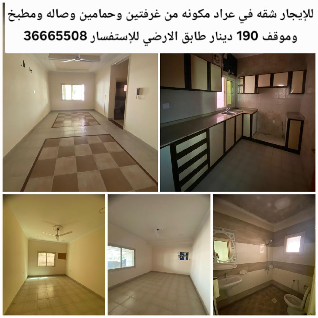 البحرين - عراد للإيجار: شقة في عراد مكونة من غرفتين وحمامين وصالة ومطبخ وموقف سيارات مقابل 190 دينار، طابق أرضي. للاستفسار.