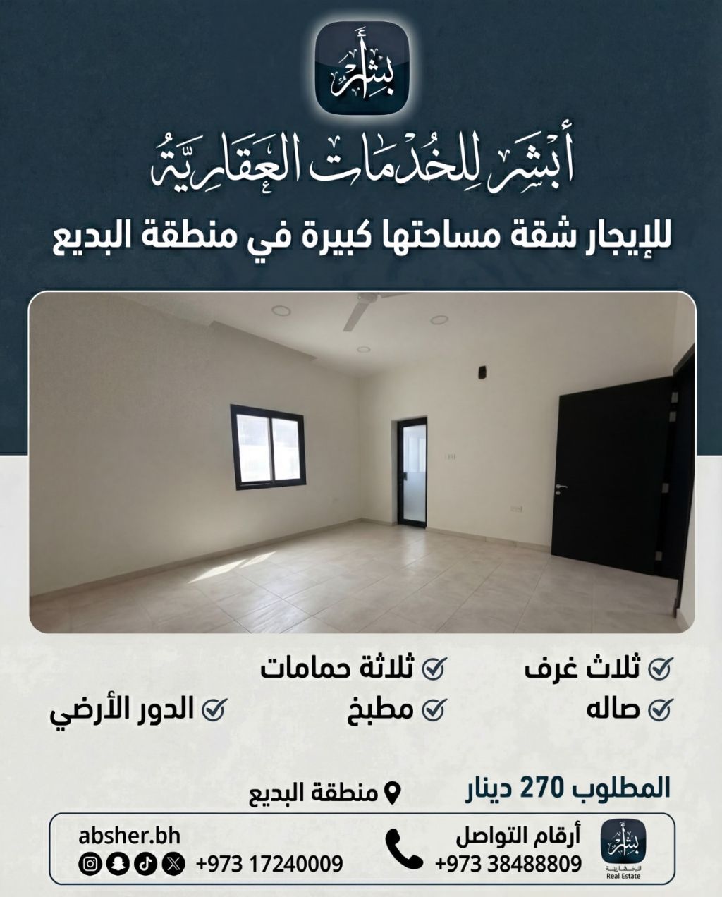 للإيجار: شقة كبيرة في منطقة البديع، مكونة من ثلاث غرف، ثلاثة حمامات، صالة، ومطبخ، في الدور الأرضي. السعر المطلوب هو 270 دينار.