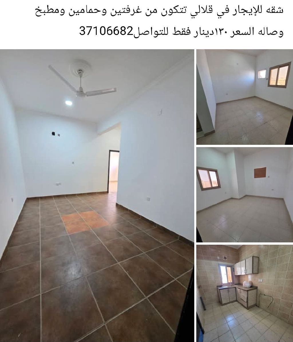 شقة للإيجار في قلالي تتكون من غرفتين وحمامين ومطبخ وصالة. السعر 130 دينار فقط. للتواصل.