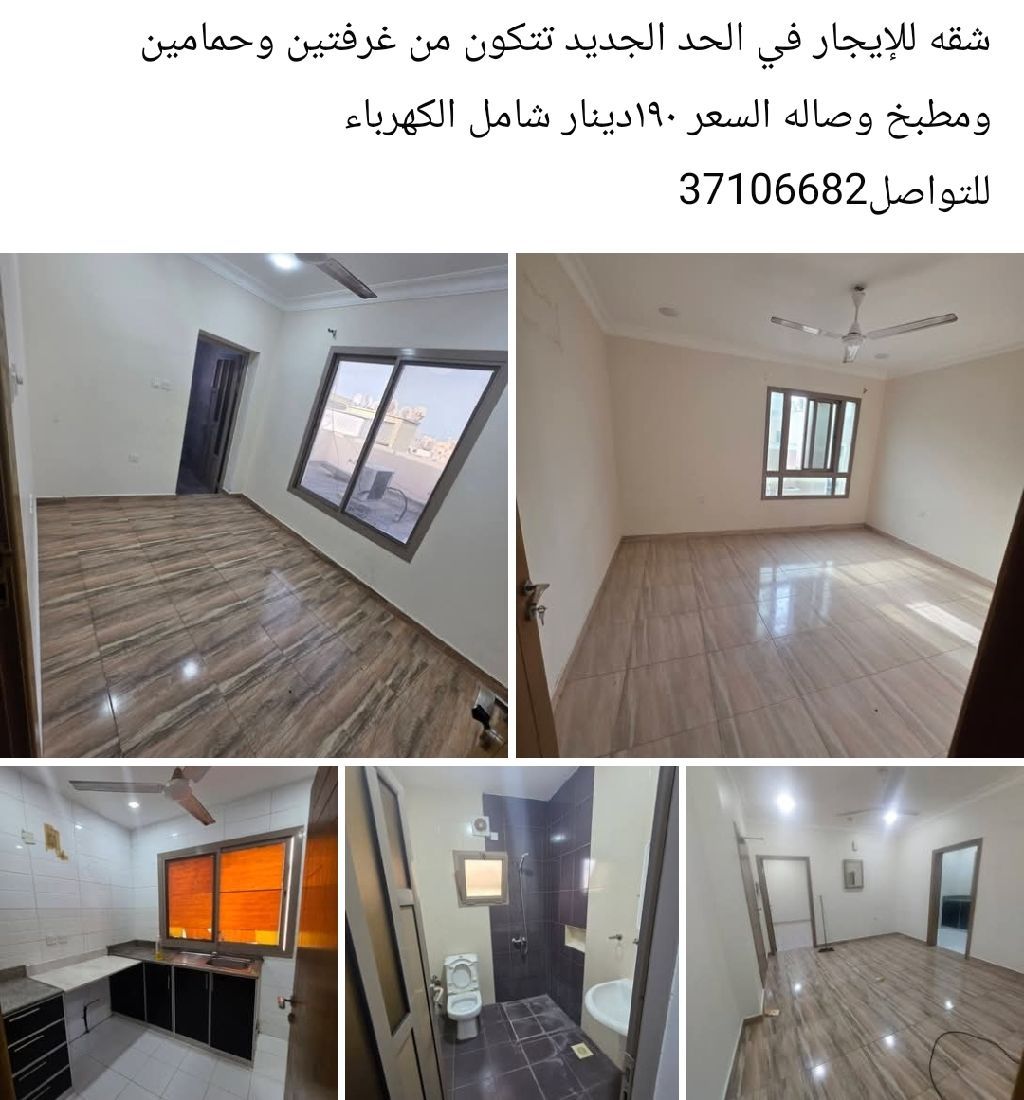 شقة للإيجار في الحد الجديد تتكون من غرفتين وثلاثة حمامات ومطبخ وصالة. السعر 190 دينار شامل الكهرباء.