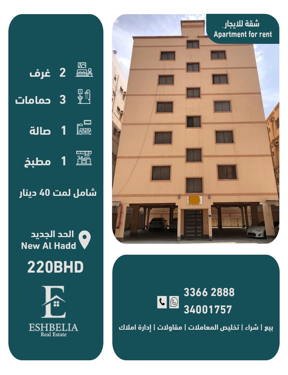 يوجد لدينا شقة للإيجار شامل الكهرباء لمدة تصل إلى 40 وحدة، مع مكيفات الهواء وخدمات أخرى. تقع في منطقة الحد الجديد، قريبة من الخدمات، خلف مسجد الزامل. تتكون الشقة من 2 غرف نوم، 3 حمامات، 1 صالة، و1 مطبخ. ملاحظة: يوجد موقف سيارات ومصعد في المبنى. سعر الإيجار 220 دينار. رقم الرخصة B201804/0125. للتواصل مع مكتب إشبيلية، بو عبدالله. رقم الإعلان 156.