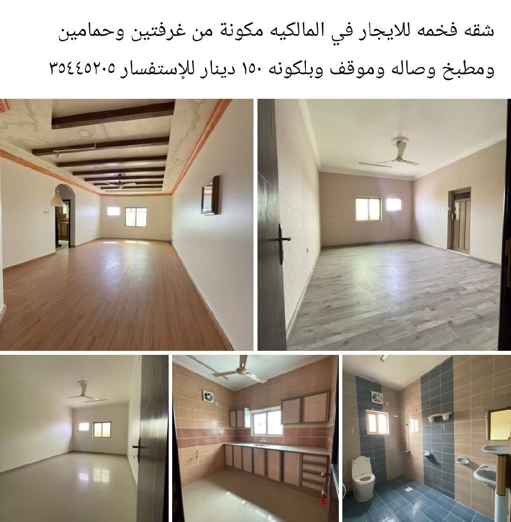 شقة فخمة للإيجار في المالكية، مكونة من غرفتين وحمامين ومطبخ وصالة وموقف وبلكونة، بسعر 150 دينار.