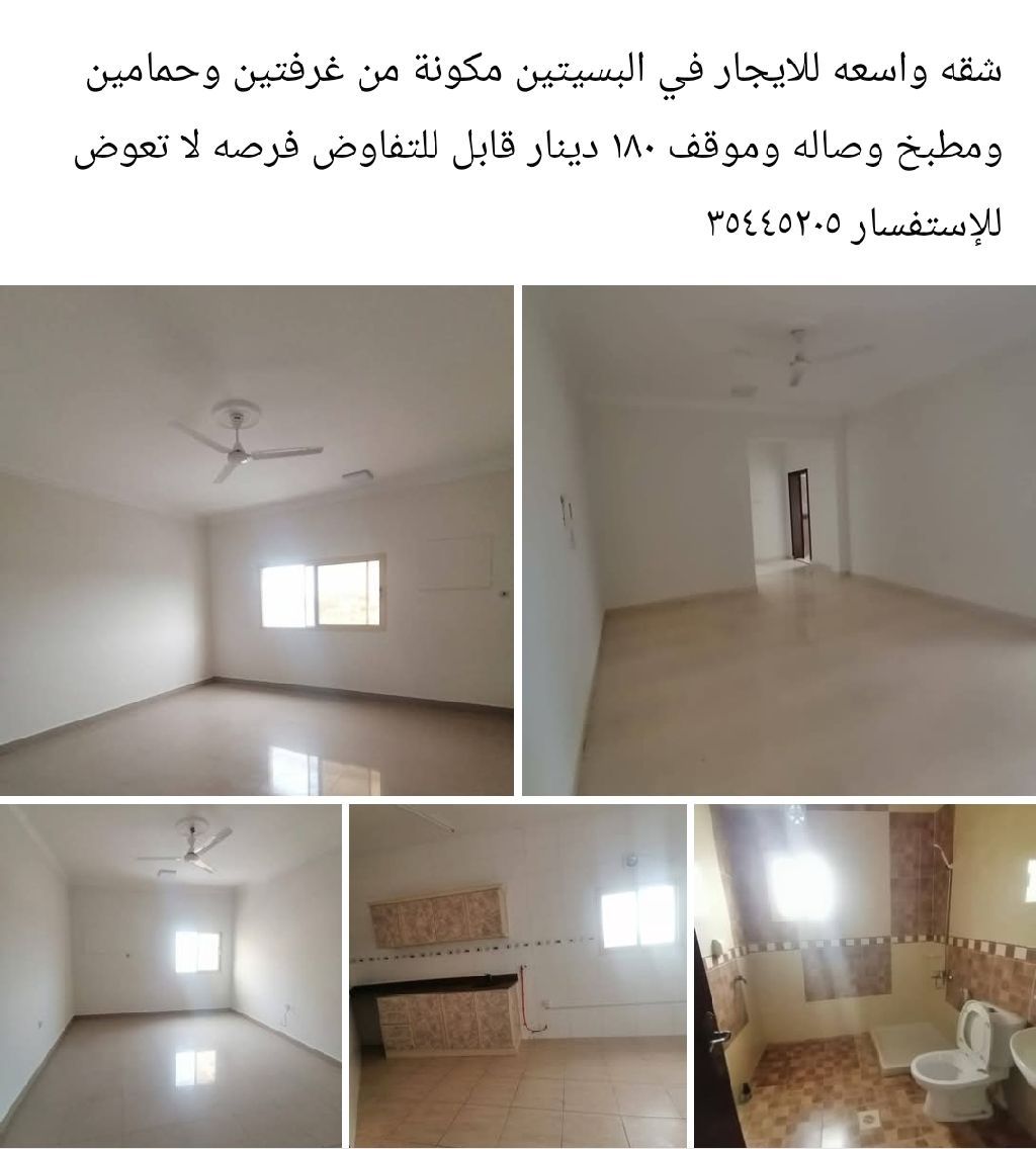 شقة واسعة للإيجار في البسيتين، مكونة من غرفتين وحمامين ومطبخ وصالة وموقف. 180 دينار قابل للتفاوض. فرصة لا تعوض.