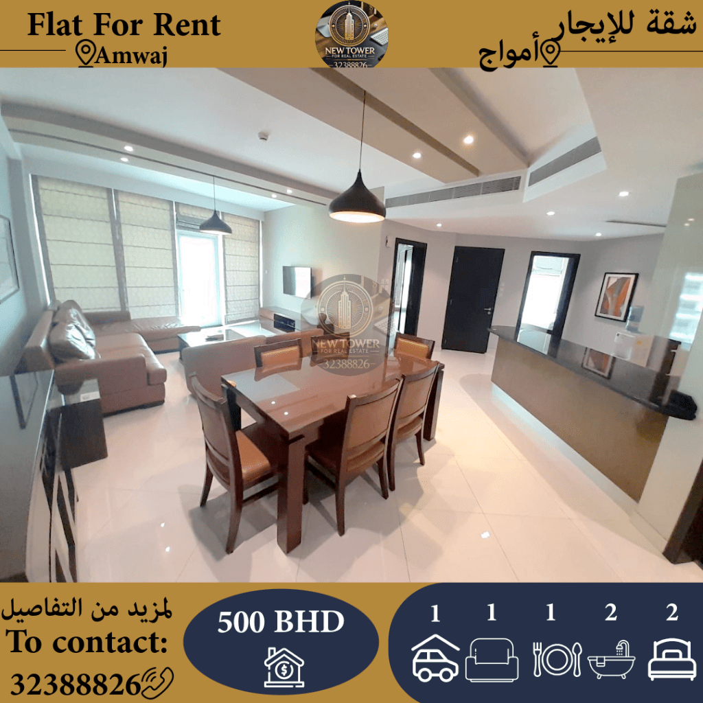 للإيجار: شقة فخمة مفروشة في أمواج، تحتوي على غرفتين نوم، حمامين، مطبخ، صالة، مصعد، موقف سيارة، بركة سباحة، وجيم. السعر: 500 دينار بحريني. للتواصل.