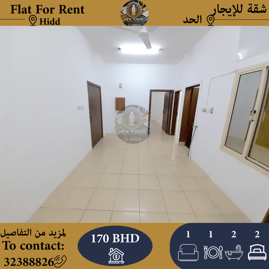 للإيجار شقة في الحد، غرفتين، حمامين، مطبخ، صالة، شاملة الكهرباء. السعر: 170 دينار بحريني. للتواصل.