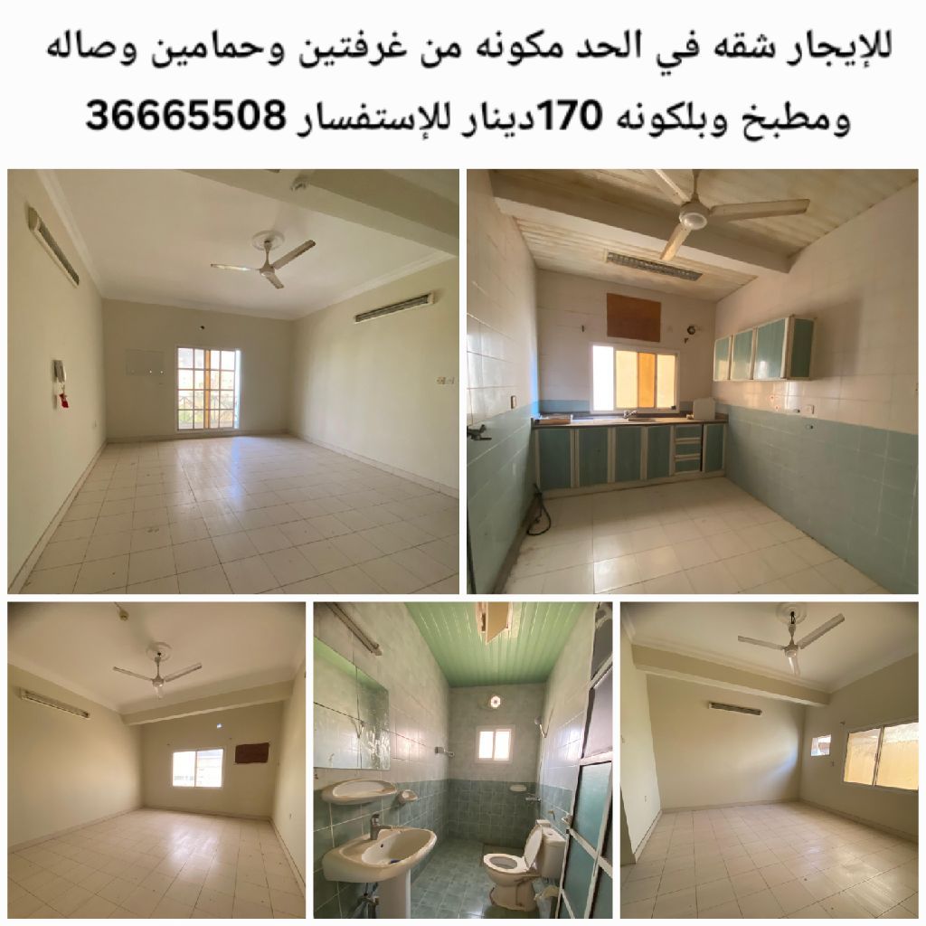 للإيجار شقة في الحد مكونة من غرفتين وحمامين وصالة ومطبخ وبلكونة وموقف بـ 170 دينار وقابل للتفاوض.
