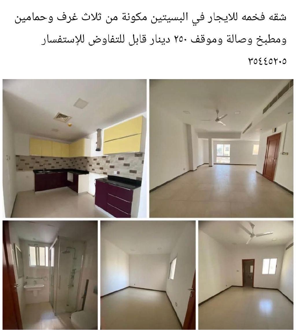 شقة فخمة للإيجار في البسيتين مكونة من ثلاث غرف وحمامين ومطبخ وصالة وموقف، بسعر 250 دينار قابل للتفاوض