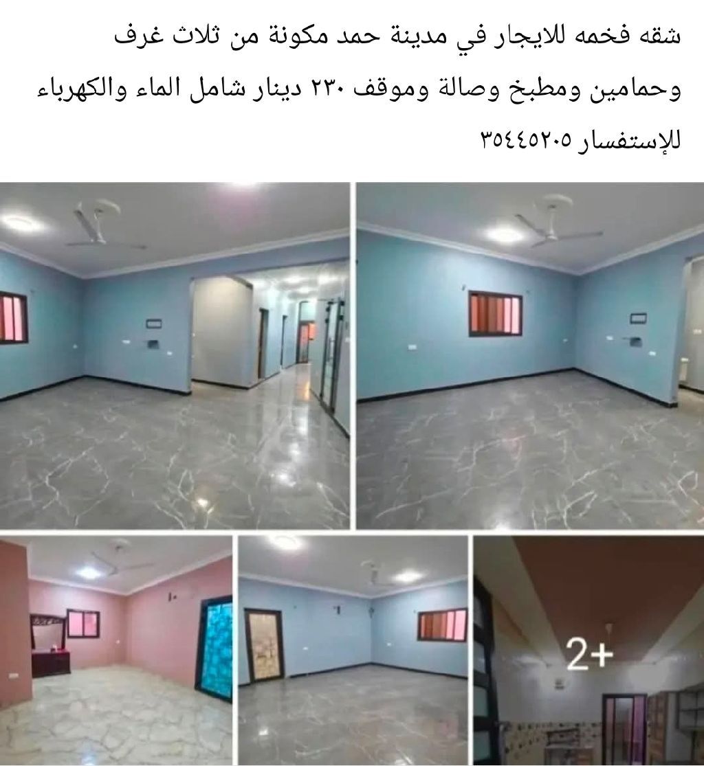 شقة فخمة للإيجار في مدينة حمد، مكونة من ثلاث غرف وحمامين ومطبخ وصالة وموقف، بسعر 230 دينار شامل الماء والكهرباء