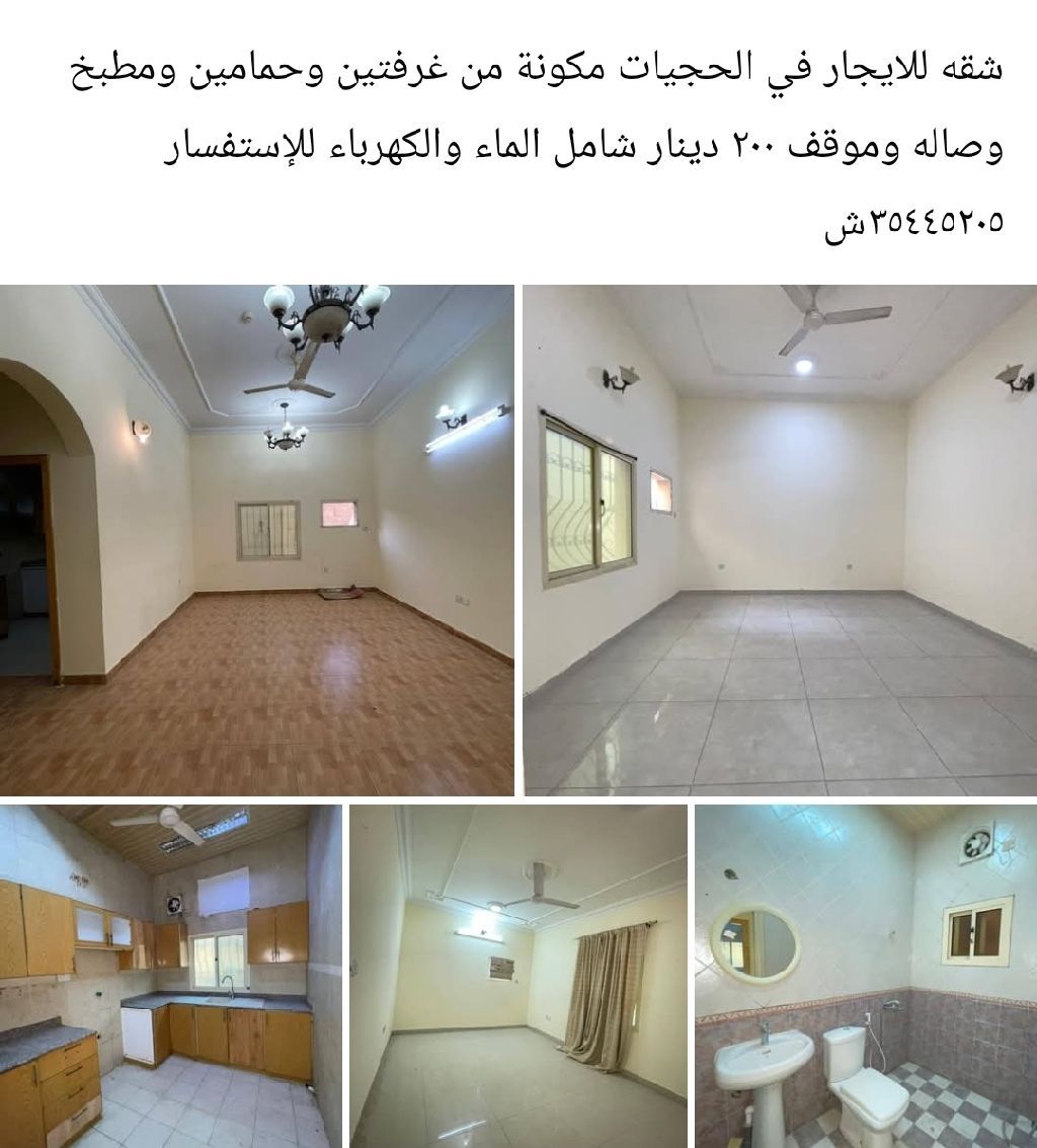 شقة للإيجار في الحجيات، مكونة من غرفتين وحمامين ومطبخ وصالة وموقف، بسعر 200 دينار شامل الماء والكهرباء