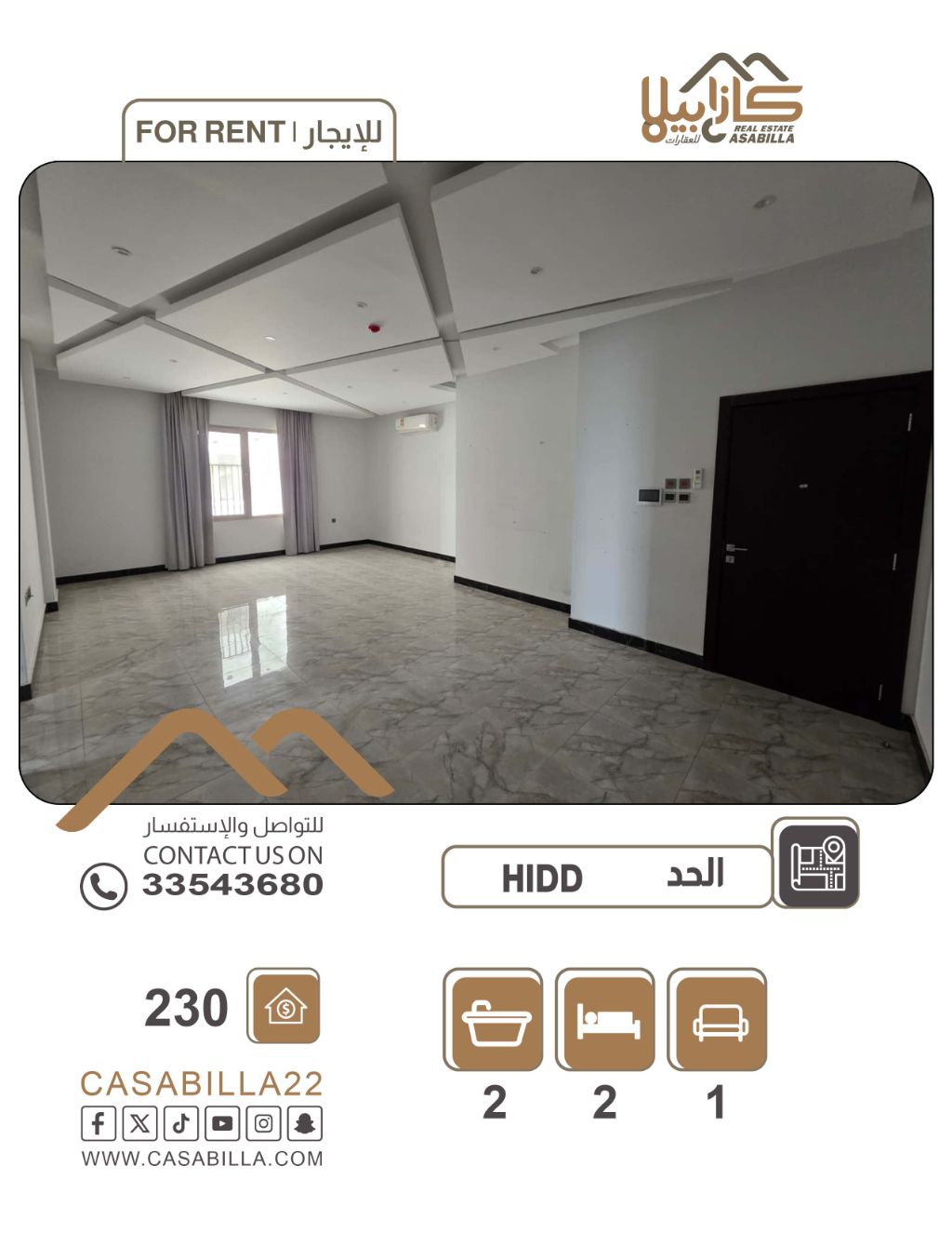 فرصة للإيجار: شقة في منطقة الحد مع المكيفات والستائر. تفاصيل الشقة: غرفتين (غرفة ماستر)، حمامين، صالة واسعة جداً، مطبخ، بلكونة. المرافق والخدمات: مصعد، موقف مظلل خاص. موقع مميز بالقرب من جميع الخدمات، مع المكيفات والستائر. سعر الإيجار: 230 دينار بدون الكهرباء. للتواصل.