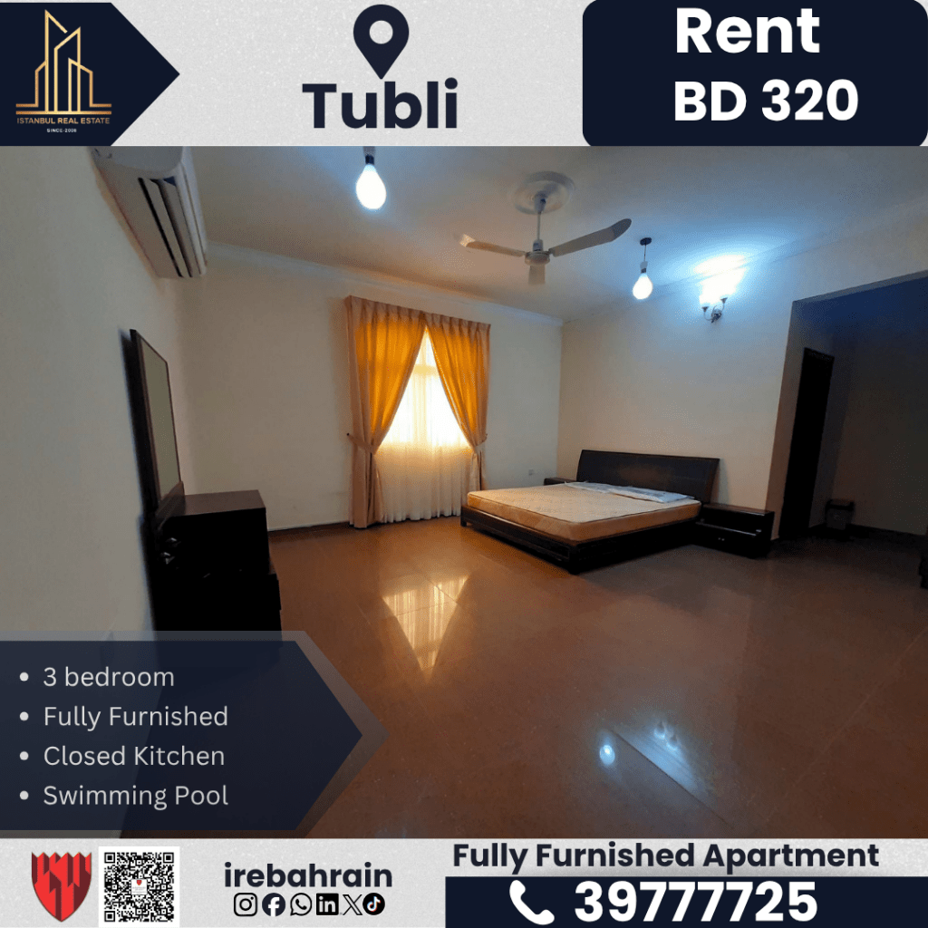 شقة للإيجار - 3 غرف نوم - توبلي 320 دينار بحريني، مفروشة بالكامل. 3 غرف نوم، حمامان، مصعد متوفر، مطبخ مغلق، مسبح متوفر، عداد مياه مستقل، موقف سيارات متوفر، موقع مميز في توبلي بالقرب من سيتي ريزورت، سوبر ماركت الحلو، وممشى توبلي، على بعد 1.5 كم فقط من معرض أنصار. الإيجار 280 دينار بحريني (بدون كهرباء ومياه). اتصل أو راسلنا.